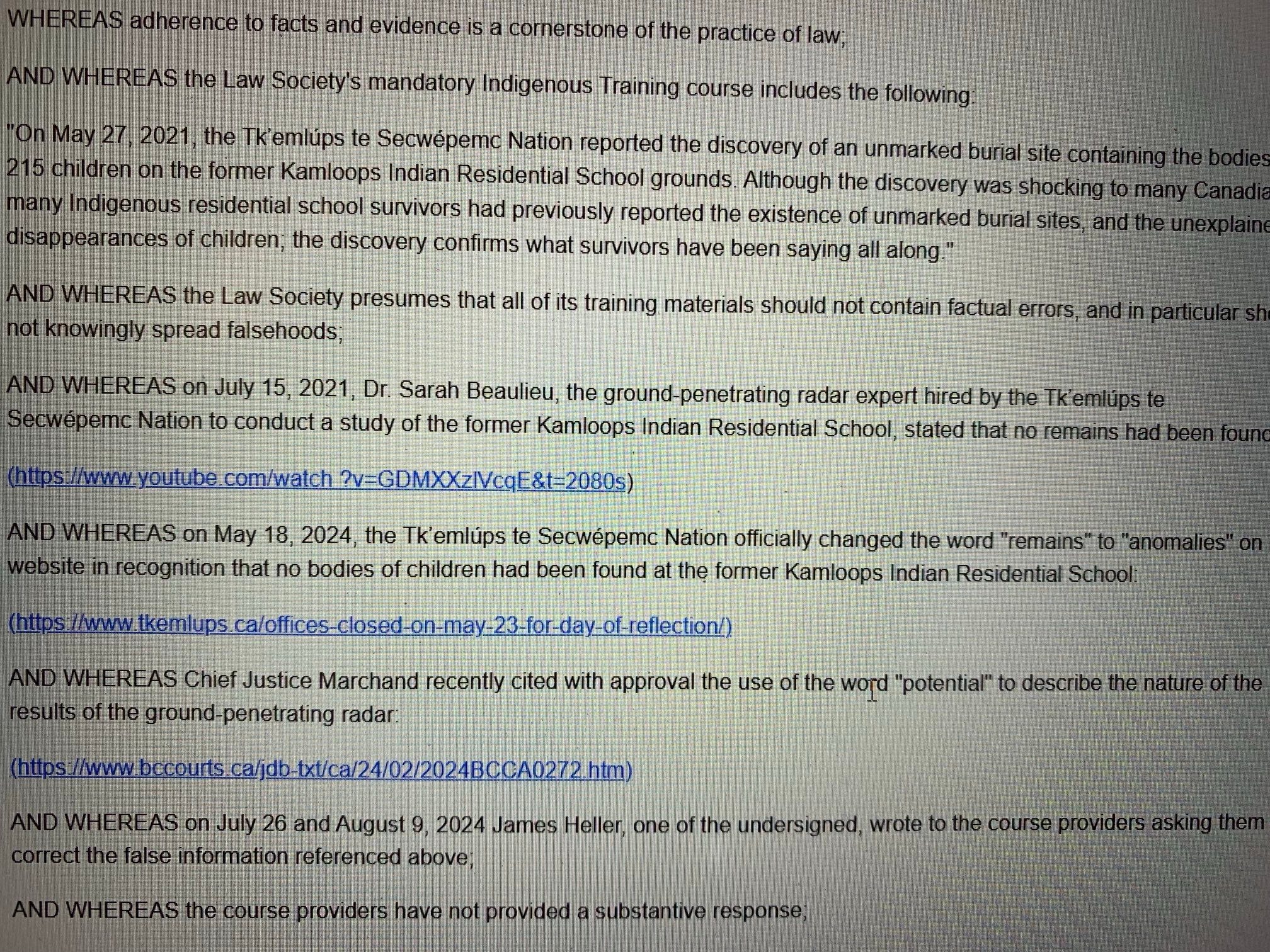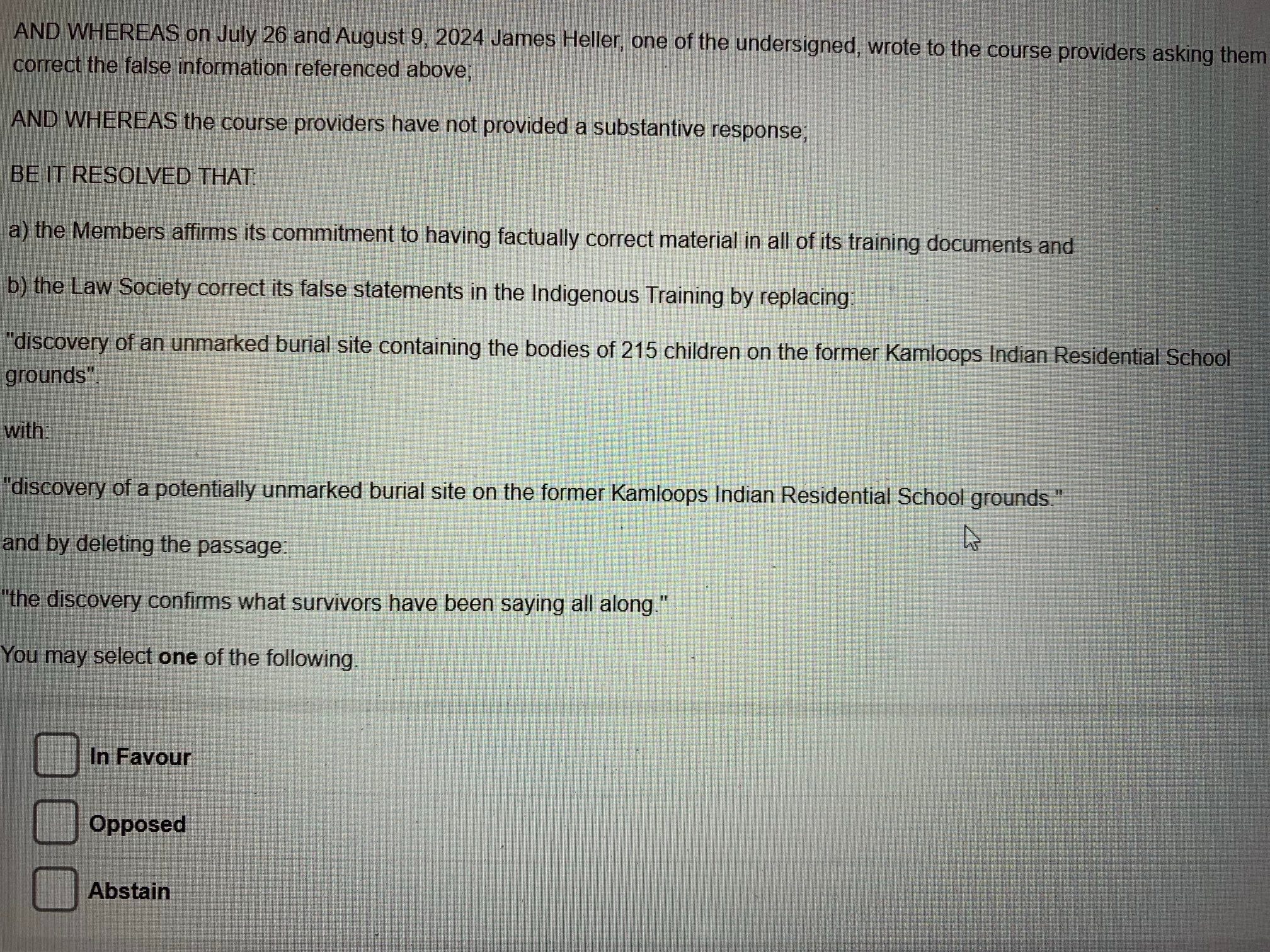 The Law Society of British Columbia is currently voting on whether to remove the following from its mandatory course for all lawyers in the province – “the discovery of an unmarked burial site on the former Kamloops Indian Residential School grounds.”